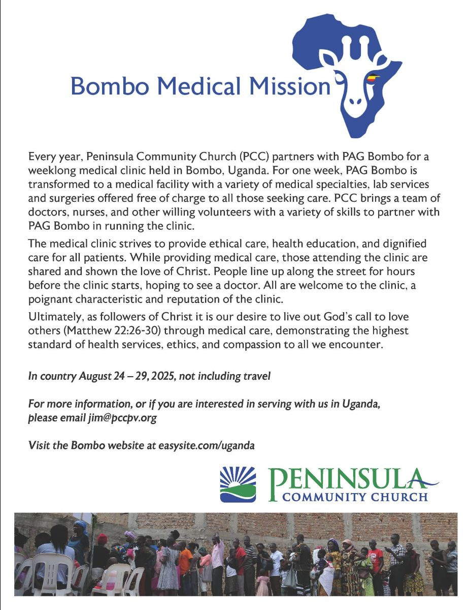 If you have medical skills or a heart for caring for those with health concerns, our friends at Peninsula Community Church invite you to join them this year on their annual Bombo Medical Mission. For more information, read the letter below and email [email protected]. Feel free to spread the word to friends and family who might be interested. WEEBALE!