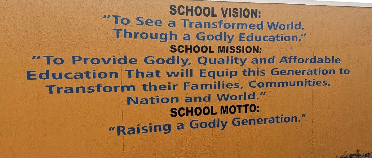 Donela School vision, mission, and motto painted on a wall leading into Donela High