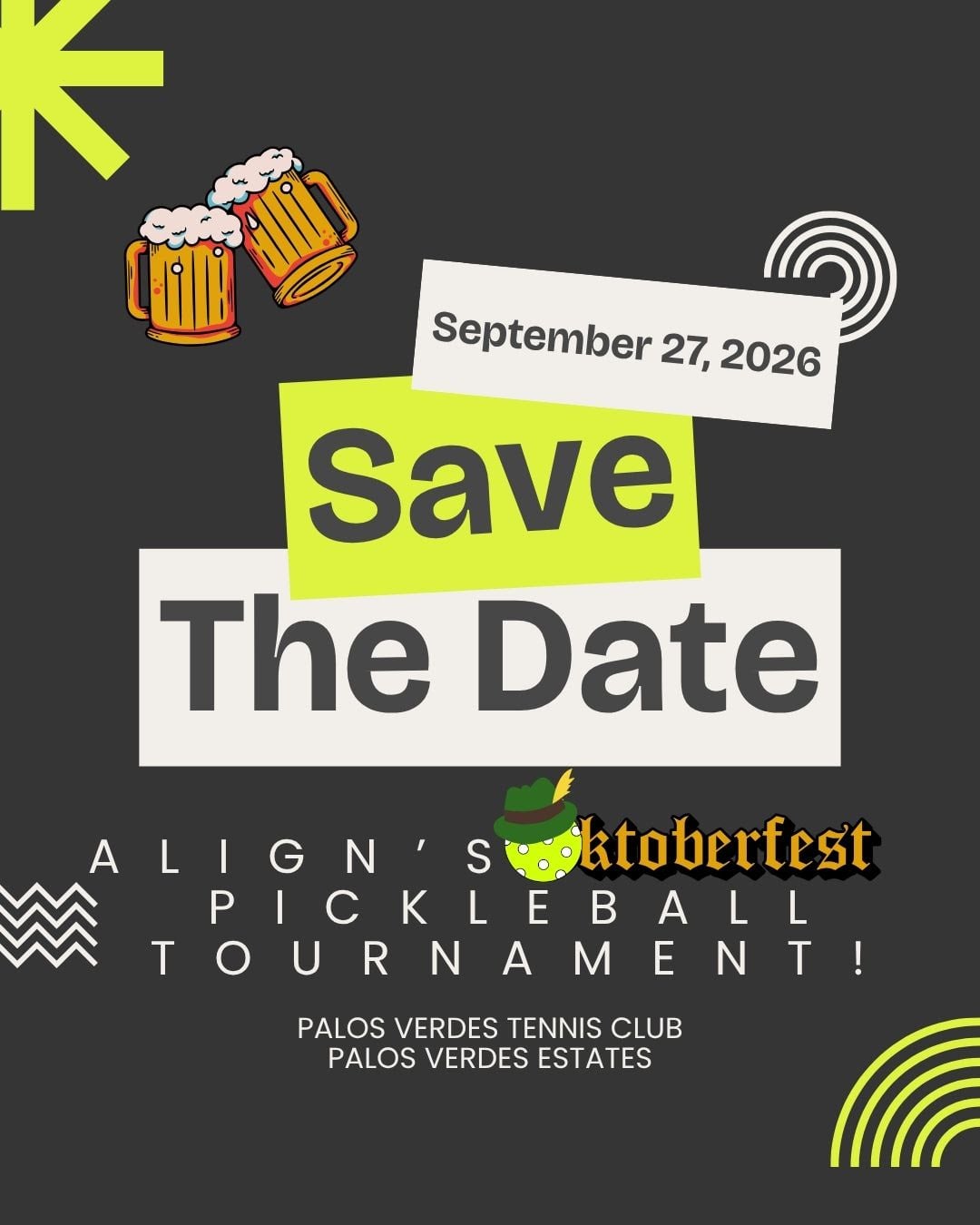We're mixing things up for this year's 5th annual Dinkin for da Kids pickleball tournament by incorporating some Oktoberfest fun. Feel free to come dressed in your finest lederhosen or dirndl, and enjoy dinking and smashing at the Palos Verdes Tennis Club. Indulge in some bratwurst, pretzels and other goodies after a fabulous day of pickleball. Stay tuned!