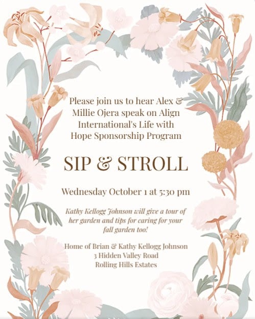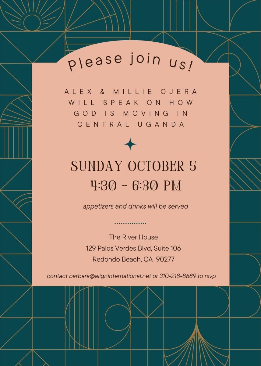 We will hold a patron event for those who have donated or are interested in learning more about how God is moving through the partnership between Align and our Ugandan partners, especially in the Donela School System. The event will be held Sunday October 5 from 4:30 - 6:30 pm at The River House in Redondo Beach. See the invitation above for more details. Just contact Barbara at [email protected]/310-218-8689 for questions and to RSVP.